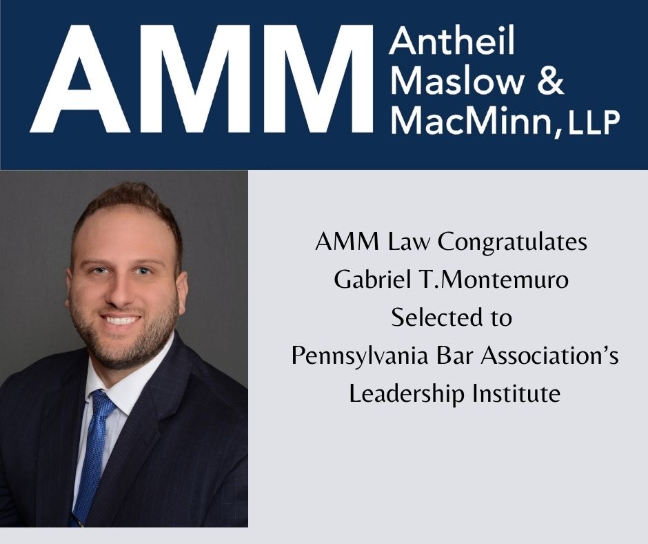 Antheil Maslow & MacMinn, LLP, (AMM Law) is proud to announce that Gabriel T. Montemuro has been selected to the Pennsylvania Bar Association’s Leadership Institute Class of 2024-25. According to the Pennsylvania Bar Association’s website, “The criteria for application is a demonstration of leadership ability in some capacity, a willingness to make the time commitment to the ten-month program and age 40 years or younger or have practiced five years or less.”