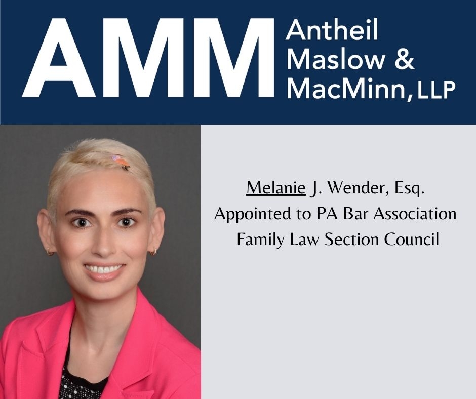 Antheil Maslow & MacMinn, LLP (AMM Law) Family Law attorney Melanie J. Wender was appointed to the Pennsylvania Bar Association’s Family Law Section Council at the July 11th Summer meeting held at the Hyatt Regency Chesapeake in Cambridge, Md.