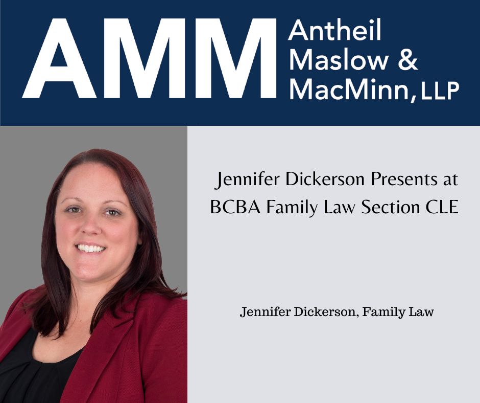 Jennifer Dickerson, Family Law attorney with Antheil Maslow & MacMinn LLP, will join a panel of presenters at the Bucks County Bar Association Family Law Section Continuing Legal Education program “Family Law 2024 in Review” on Tuesday, January 22nd . The panel will discuss highlights and changes to case law, statutes, and rules that occurred in 2024, as well as practice tips and pointers to apply in 2025. For more information or to register for this program, visit bucksbar.org/calendar.