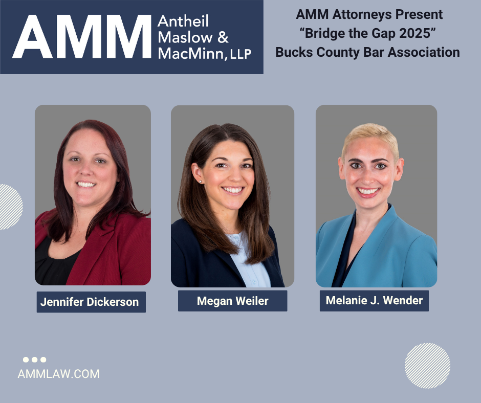 Three Family Law attorneys at Antheil Maslow & MacMinn, LLP (AMM Law), Jennifer Dickerson, Megan Weiler and Melanie Wender, will join other presenters at a Continuing Legal Education program hosted by the Bucks County Bar Association from 9 AM – 1:00 PM Monday, November 17th, 2025. The CLE, entitled “Bridge the Gap 2025” is a hybrid course, and will be offered in person at the BCBA headquarters in Doylestown, or virtually, (for connection information, please rsvp). Bridge the Gap 2025 offers four (4) ethics credits.